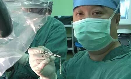 左女士焦急地带着小飞前往广东三九脑科医院就诊。该院神经外六科主任吴杰查看患者的磁共振检查片子发现,患者左侧额叶占位病变,结合患者的症状,高度怀疑患者抽搐系颅内寄生虫感染所致。完善相关检查及评估后,6月27日,在全麻下为患者施行“左额叶占位病变探查及切除术”。术中,取出一条长约7.5厘米的白色裂头蚴活虫。